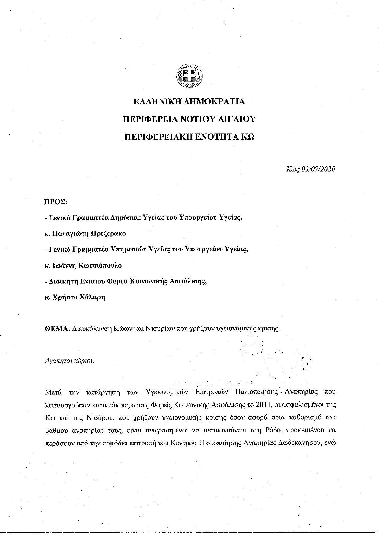 ΤΟΠΙΚΑ ΝΕΑ ΥΓΕΙΑ Έπαρχος Κω–Νισύρου: Έτσι θα διευκολύνονται Κώοι & Νισύριοι που χρήζουν υγειονομική κρίση (ΚΕΠΑ) 07/07/2020 09:367 SHARE …