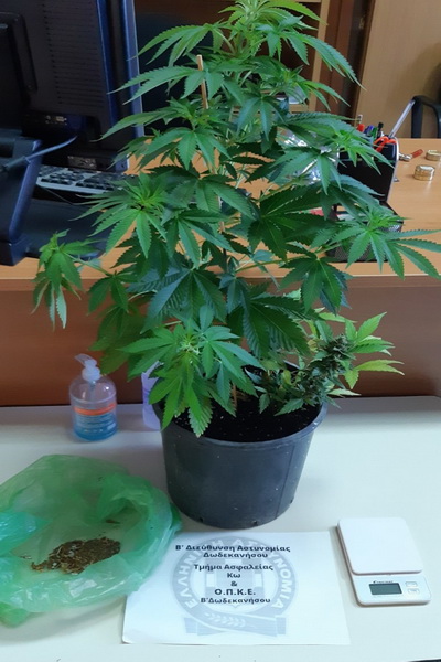 α) από αστυνομικούς του Αστυνομικού Τμήματος Ηρακλειδών Κω, 29χρονος ημεδαπός γιατί έπειτα από έρευνα που έγινε στην κατοικία του βρέθηκαν κάνναβη ακατέργαστη βάρους -13- γραμμ., μια ζυγαριά ακριβείας και δυο δενδρύλλια κάνναβης που καλλιεργούσε μέσα σε γλάστρα.