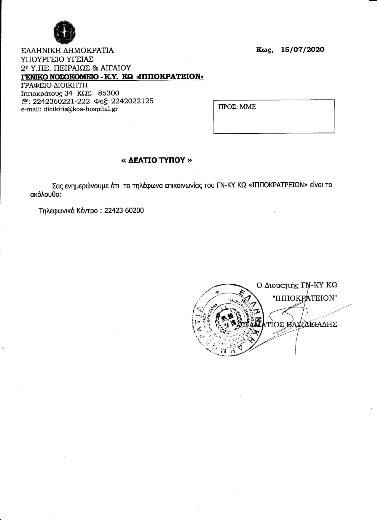 Αυτό είναι το τηλέφωνο επικοινωνίας του Νοσοκομείου της Κω