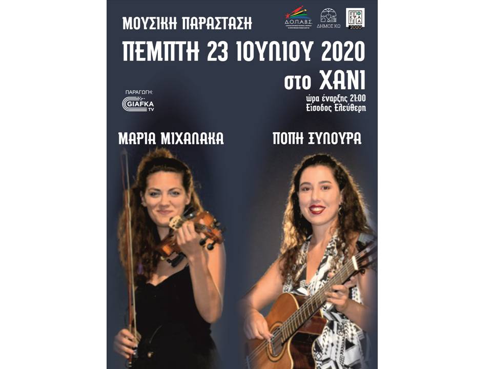 Το Τμήμα Πολιτισμού του ΔΟΠΑΒΣ στο πλαίσιο των θερινών Ιπποκρατείων 2020 διοργανώνει συναυλία ποικίλης μουσικής με την Πόπη Ξυλουρά και τη Μαρία Μιχαλάκα την Πέμπτη 23 Ιουλίου στις 9 το βράδυ στο Ιστορικό και Λαογραφικό Μουσείο Κω (Χάνι).