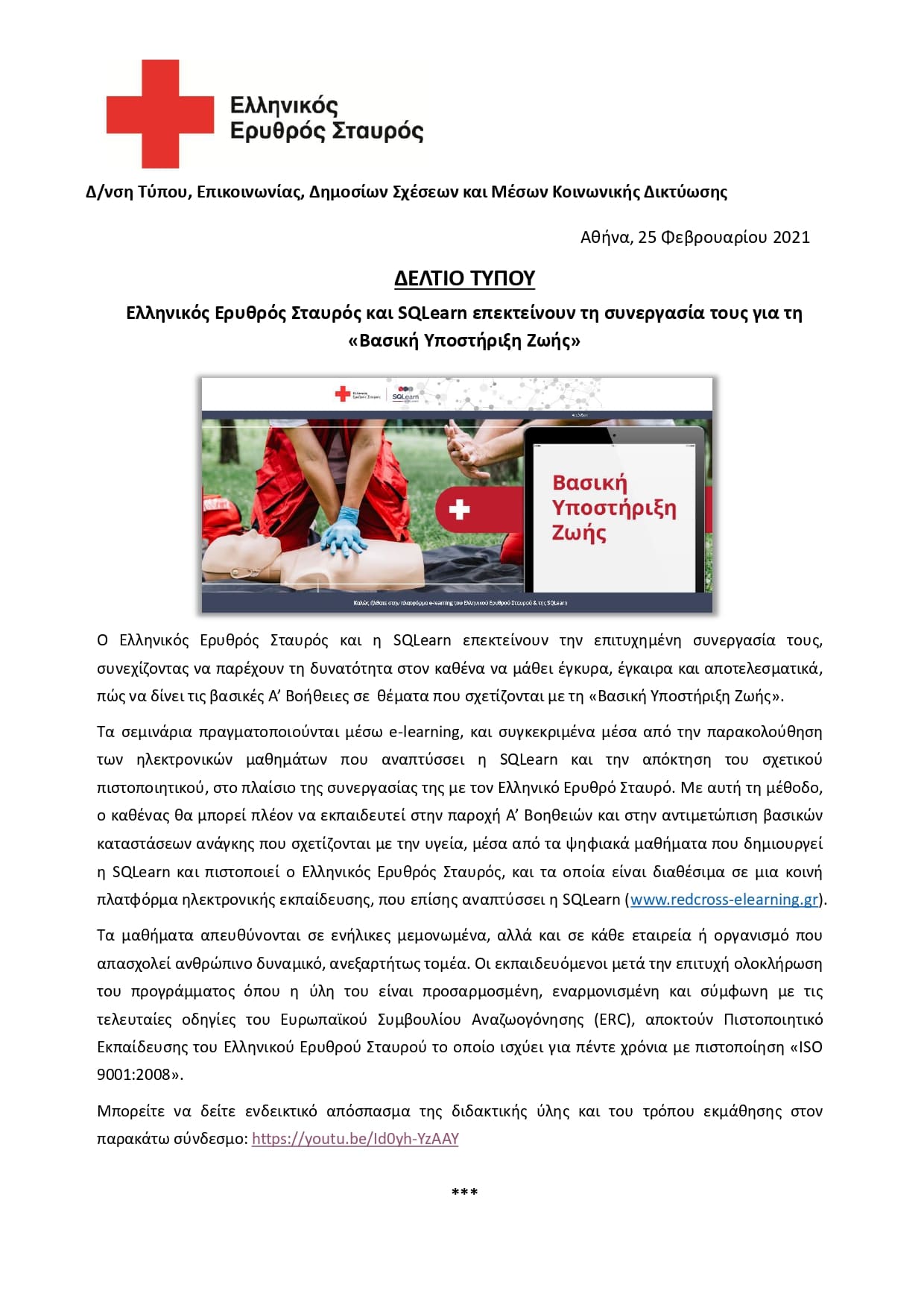 ... ΤΟΠΙΚΑ ΝΕΑ ΥΓΕΙΑ Ο Ελληνικός Ερυθρός Σταυρός και η SQLearn επεκτείνουν τη συνεργασία τους για τη «Βασική Υποστήριξη Ζωής» 26/02/2021 13:235 SHARE …