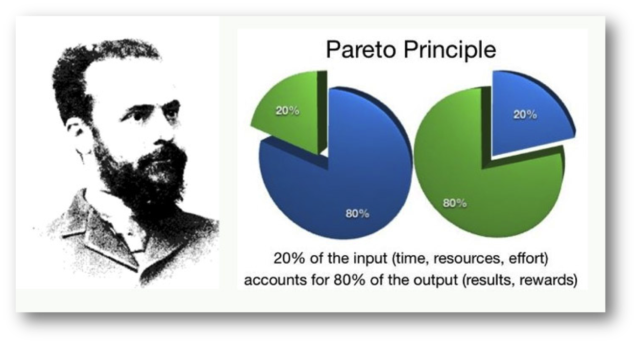 Η αρχή ξεκίνησε την καριέρα της , ως αρχή του Παρέτο , από το όνομα του Ιταλού οικονομολόγου και κοινωνιολόγου Βιλφρέντο Παρέτο , ο οποίος την διατύπωσε το 1897. Μελετώντας την κατανομή του πλούτου στην Αγγλία , ανακάλυψε ότι το 20% του πληθυσμού κατείχε το 80% του χρήματος. Διερευνώντας περαιτέρω , ανακάλυψε ότι η ίδια αναλογία επανερχόταν όπου κι αν κοίταζε , σε διαφορετικές εποχές και σε διαφορετικές χώρες. Και αυτό ήταν όλο , κανένας δεν έδωσε ιδιαίτερη σημασία. Μέχρι τον Β’ Παγκόσμιο Πόλεμο τουλάχιστον , οπότε δύο Αμερικανοί ερευνητές- ένας φιλόλογος και ένας μηχανικός – επανάφεραν το εύρημα του Παρέτο. Ο φιλόλογος ήταν ο Τζόρτζ Ζιπφ , ο οποίος το 1949 επαναδιατύπωσε αυτό που αποκάλεσε «αρχή της ελάχιστης προσπάθειας».