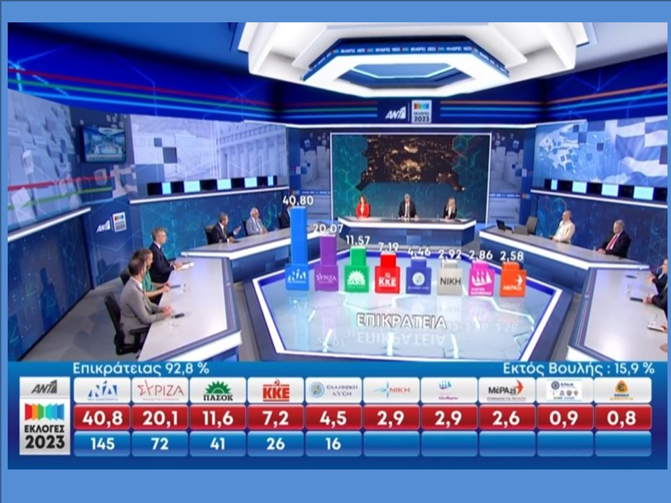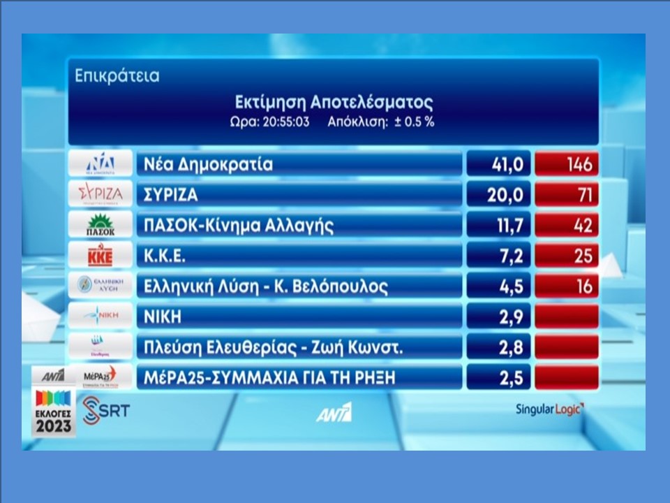 Εκλογές: Εκτίμηση αποτελέσματος και έδρες με κερδισμένους για την ώρα ΝΔ και ΠΑΣΟΚ 21/05/2023 ΠΟΛΙΤΙΚΗ - ΟΙΚΟΝΟΜΙΑ ΤΟΠΙΚΑ ΝΕΑ0 SHARE Σύμφωνα με την εκτίμηση αποτελέσματος του ANT1, με κερδισμένους για την ώρα ΝΔ, ΠΑΣΟΚ, Πλεύση Ελευθερίας, Νίκη READ MORE