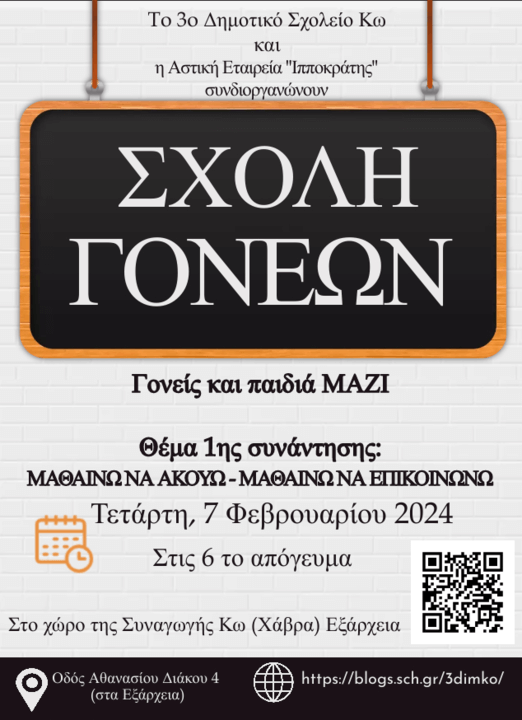 H πρώτη συνάντηση της “Σχολής Γονέων” στη Χάβρα 05/02/2024 ΤΟΠΙΚΑ ΝΕΑ0 SHARE Το 3ο Δημοτικό Σχολείο Κω σας προσκαλεί στην πρώτη συνάντηση της Σχολής Γονέων που διοργανώνει READ MORE