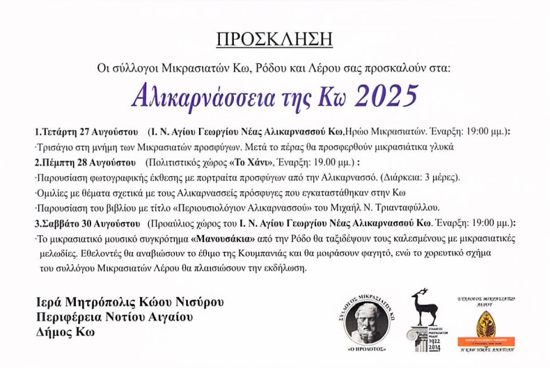 ΠΟΛΙΤΙΣΜΟΣ Αλικαρνάσσεια της Κω: Τριήμερες εκδηλώσεις από 27 έως 30 Αυγούστου (Αναλυτικά) 25/08/2025 13:332 SHARE Αλικαρνάσσεια της Κω: Τριήμερες εκδηλώσεις από 27 έως 30 Αυγούστου …