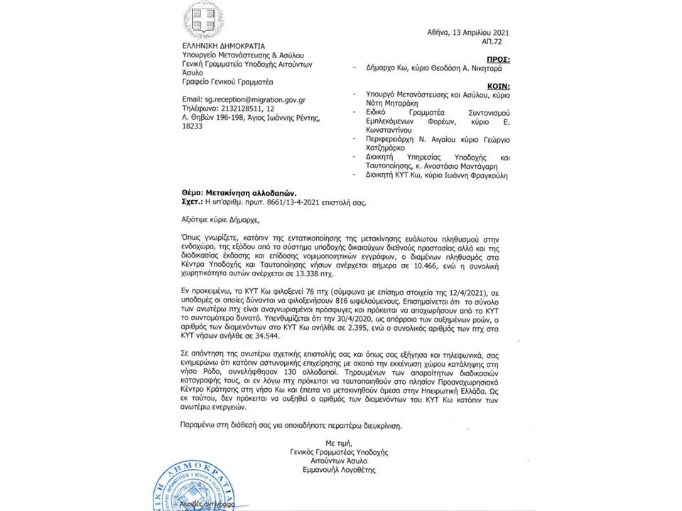 Στην χθεσινή επιστολή του Δημάρχου Κω Θεοδόση Νικηταρά στο Υπουργείο Μετανάστευσης & Ασύλου, με την οποία αντέδρασε στην μετακίνηση προσφύγων και μεταναστών… στο ΚΥΤ της Κω, απάντησε ο Γενικός Γραμματέας Υποδοχής Αιτούντων Άσυλο Εμμανουήλ Λογοθέτης, ο οποίος δηλώνει ότι όσοι μετακινήθηκαν από Ρόδο, προκειμένου να προωθηθούν στην Ηπειρωτική Ελλάδα, πρόκειται να ταυτοποιηθούν στο ΚΥΤ Κω και θα αναχωρήσουν άμεσα.