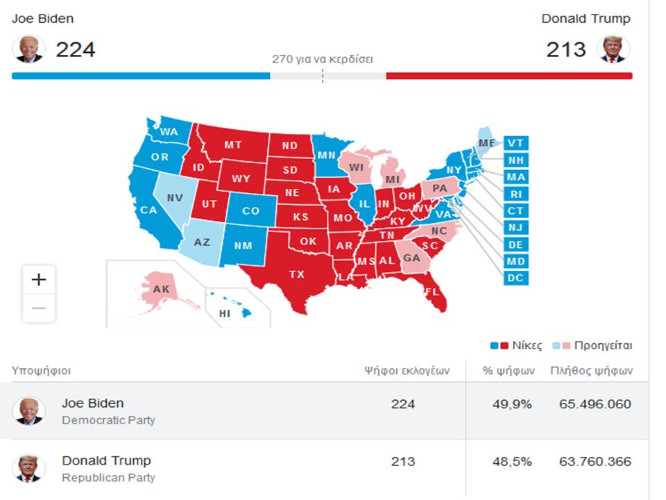 Με καταμετρημένο το 97% των ψήφων, ο Μπάιντεν συγκεντρώνει ποσοστό 49,8% και ο Ντόναλντ Τραμπ 48,6%. Ο πρώτος κερδίζει και την πολιτεία του Μίσιγκαν.