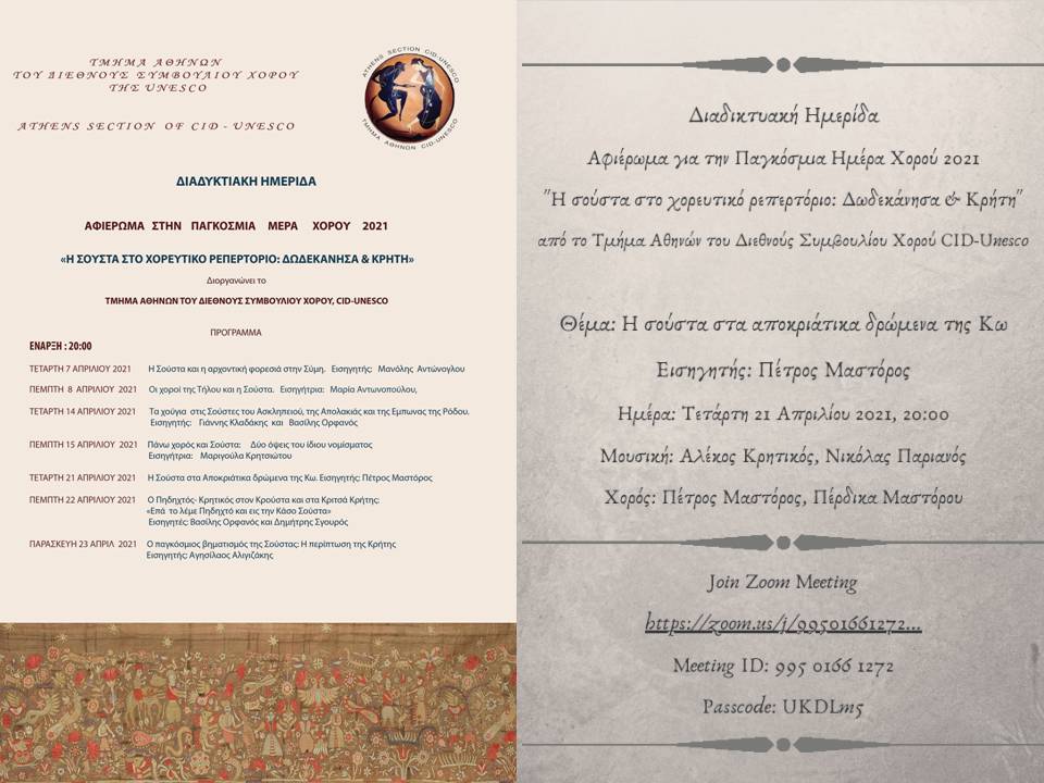 Σας ενημερώνουμε για τη συμμετοχή του κ. Πέτρου Μαστόρου στη Διαδικτυακή Ημερίδα… “Η σούστα στο χορευτικό ρεπερτόριο: Δωδεκάνησα & Κρήτη”. Είναι ένα αφιέρωμα για την Παγκόσμια Ημέρα Χορού 2021, με διοργανωτή το Τμήμα Αθηνών του Διεθνούς Συμβουλίου Χορού CID-Unesco.