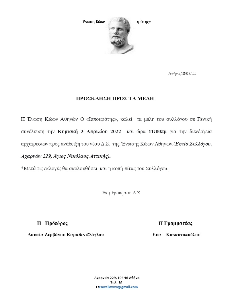 Ένωση Κώων Αθηνών: Γενική συνέλευση και κοπή πίτας στις 3/4