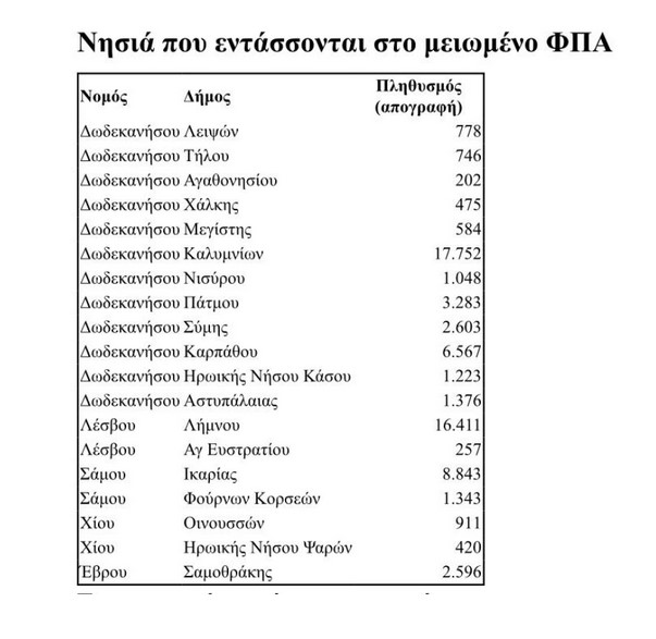 Πλέον, με την κυβερνητική εξαγγελία στο καθεστώς του μειωμένου ΦΠΑ εντάσσονται οι παρακάτω περιοχές: