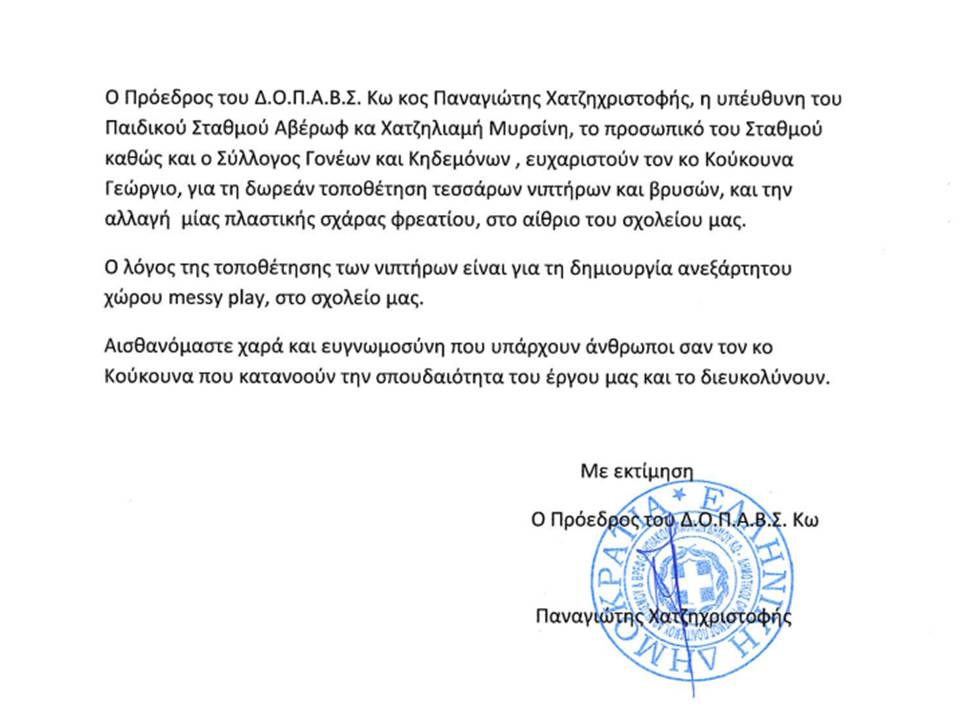 ΚΟΙΝΩΝΙΑ Ευχαριστήριο προς ιδιώτη του ΔΟΠΑΒΣ και της υπεύθυνης του Παιδικού Σταθμού στην Αβέρωφ 23/03/2022 10:470 SHARE