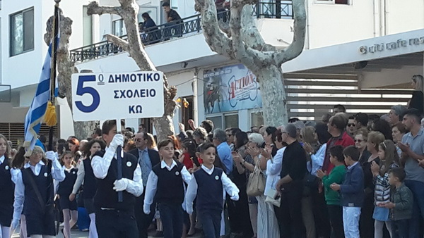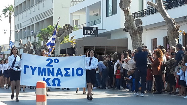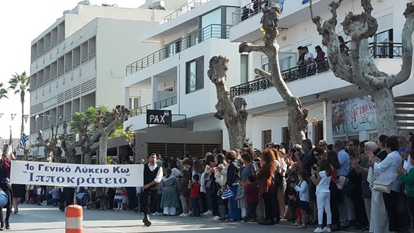 Ακολούθησε επίσης, με σύμμαχο τον καιρό και την ηλιοφάνεια παρουσία πλήθους κόσμου, η λαμπρή παρέλαση με επικεφαλής τη Φιλαρμονική του Δήμου Κω, του Ε.Ε.Σ Περιφερειακό Τμήμα Κω, των Εφεδροπολεμιστικών Οργανώσεων, των μαθητών της Δευτεροβάθμιας και Πρωτοβάθμιας Εκπαίδευσης, Προσκόπων, Οδηγών, του Παραρτήματος του Λυκείου Ελληνίδων Κω, την Ελληνική Ομάδα Διάσωσης και λοιπών Συλλόγων.