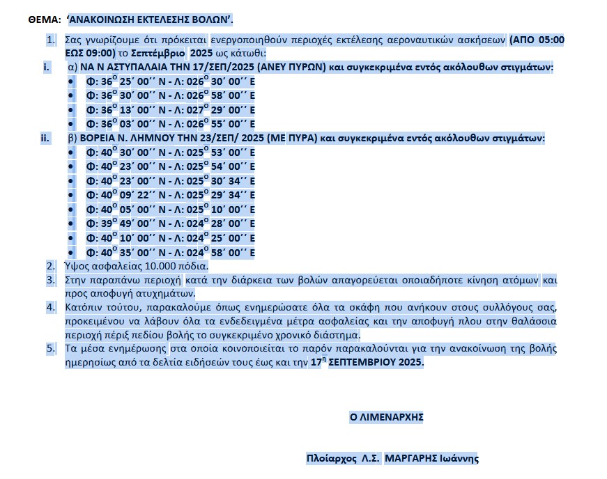 Λιμεναρχείο Κω: Εκτέλεση αεροναυτικών ασκήσεων και βολών