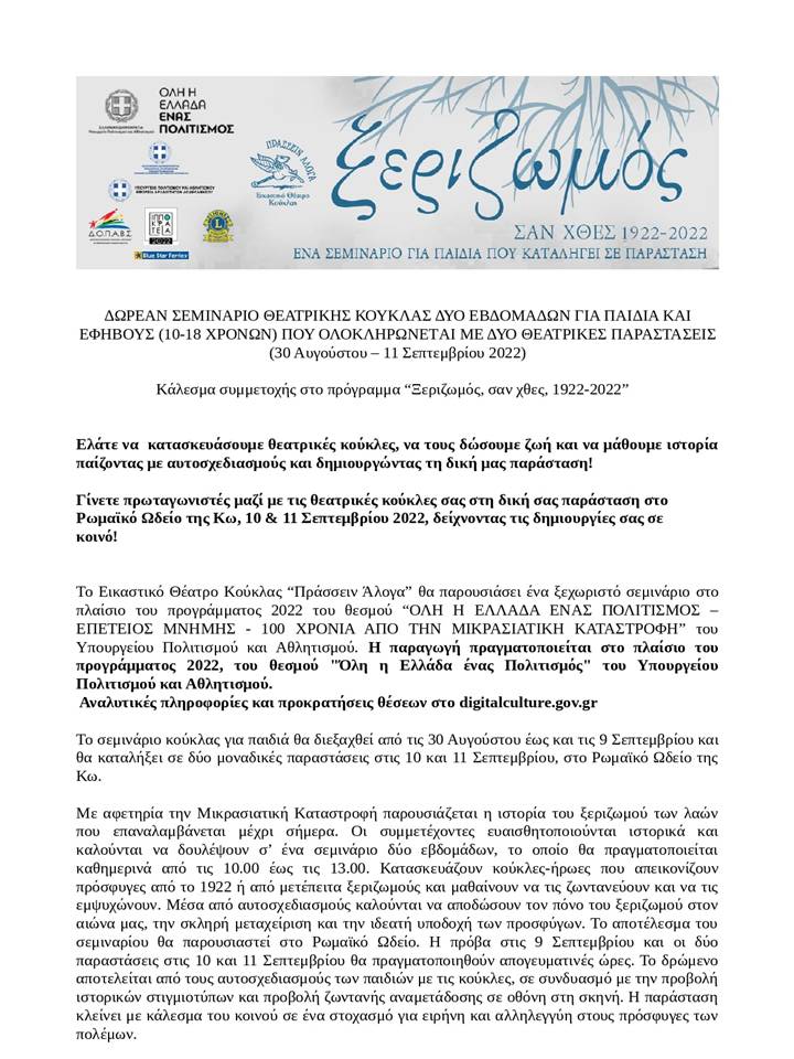 ΠΟΛΙΤΙΣΜΟΣ Lions Κω: Κάλεσμα για δωρεάν σεμινάριο που ολοκληρώνεται με 2 θεατρικές παραστάσεις 06/07/2022 08:424 SHARE