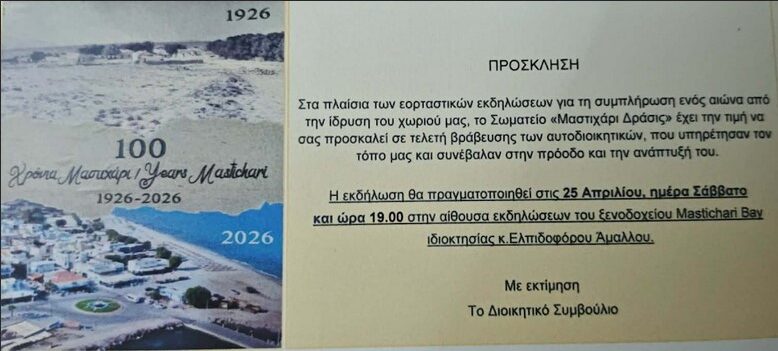 ΤΟΠΙΚΑ ΝΕΑ Μαστιχάρι Δράσις: Τελετή βράβευσης αυτοδιοικητικών, με αφορμή τη συμπλήρωση ενός αιώνα από την ίδρυση του χωριού 15/04/2026 11:073 SHARE Μαστιχάρι Δράσις: Τελετή βράβευσης αυτοδιοικητικών, με αφορμή τη συμπλήρωση ενός αιώνα από την ίδρυση του χωριού …