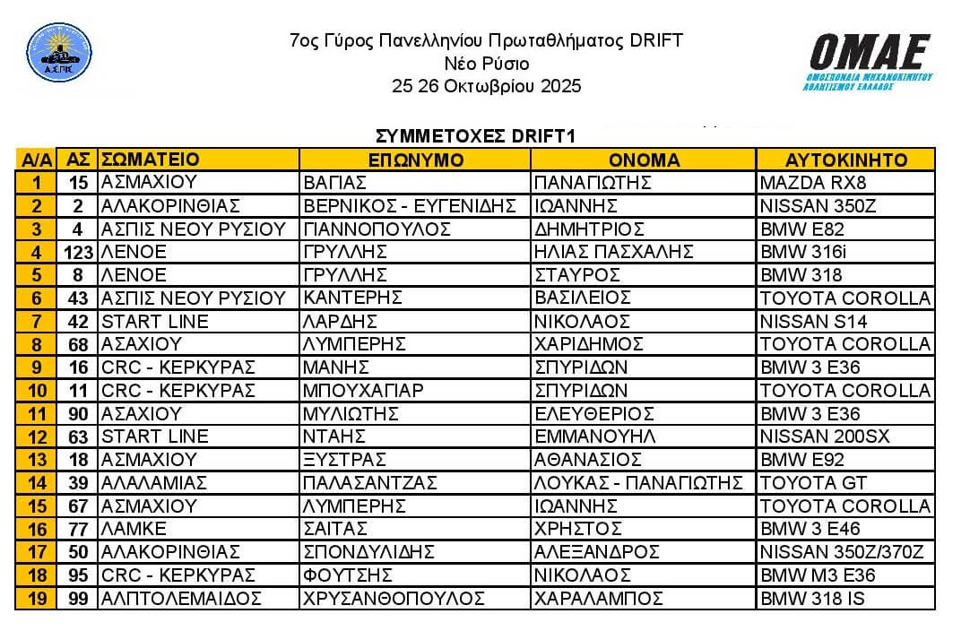 Ο έβδομος και τελευταίος γύρος του Πανελληνίου Πρωταθλήματος Drift διεξήχθει στο Drive Park στο Ρύσιο της Θεσσαλονίκης από τις 24 έως και σήμερα 26 Οκτωβρίου…με συμμετοχή 56 οδηγών και στις 3 κατηγορίες D 1,2 & 3.