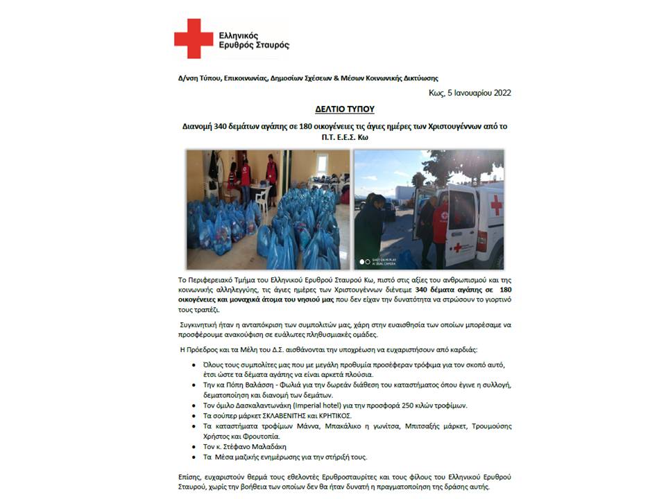 Home / ΤΟΠΙΚΑ ΝΕΑ  / Παράρτημα Ελληνικού Ερυθρού Σταυρού Κω: 340 δέματα αγάπης σε 180 οικογένειες τις Άγιες ημέρες των Χριστουγέννων