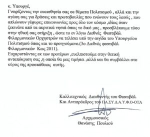 Επίσης θα πρέπει να γνωρίζετε ότι το 2010 μετά από τηλεφωνική επικοινωνία με την κα. Μανιάκα εστάλη έγγραφο στο Υπουργείο Πολιτισμού στο τμήμα Μουσικής & Τέχνης 25-1-2010 αρ.πρωτ.58 (σας το παραθέτω Νo 7) ζητώντας οικονομική ενίσχυση και να τελέσει υπό την αιγίδα του Υπουργείου Πολιτισμού. Στις 27- 4 -2010 λάβαμε την απάντηση που σας παραθέτω στο Νo 8. Όπου εν τέλει παρά την δεδομένη θετική γνωμοδότηση και πρόθεση από πλευράς του ΥΠΠΟΑ, δεν λάβαμε ποτέ καμία επιχορήγηση. Αξίζει σε αυτό το σημείο να σημειωθεί, ότι το εν λόγω πρόγραμμα επιχορηγήσεων για όσους γνωρίζουν, δεν δίνεται για 1η φορά φέτος, αλλά δίνεται εδώ και αρκετά χρόνια από το αρμόδιο Υπουργείο και επί της δικής σας θητείας όλα τα προηγούμενα έτη, ουδέποτε λάβαμε καμία επιχορήγηση.